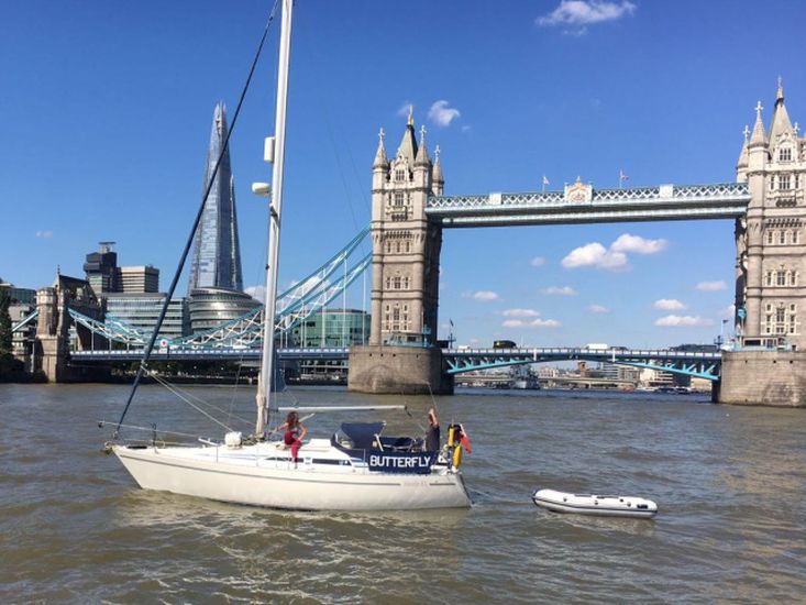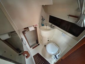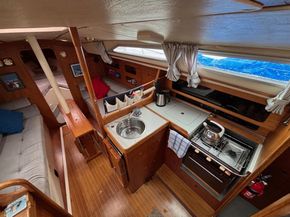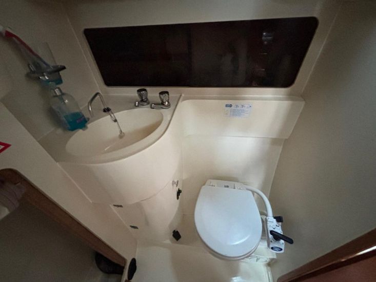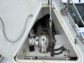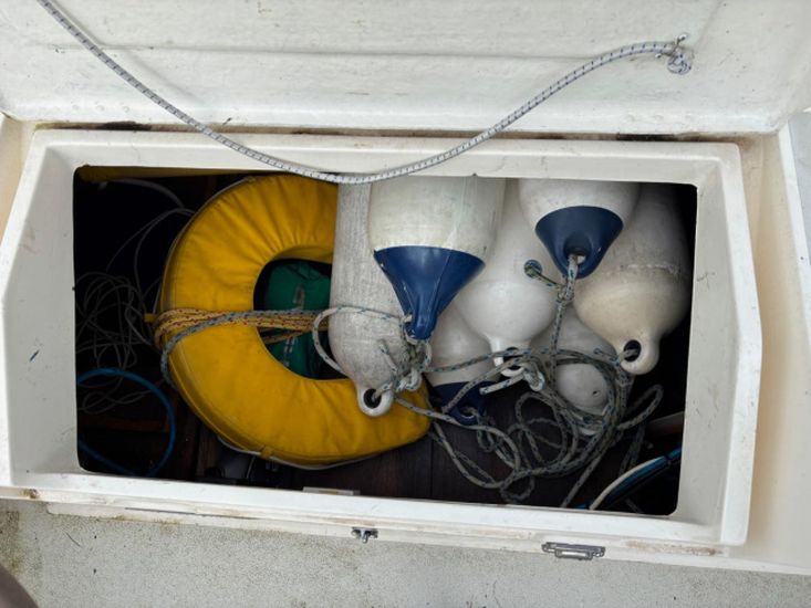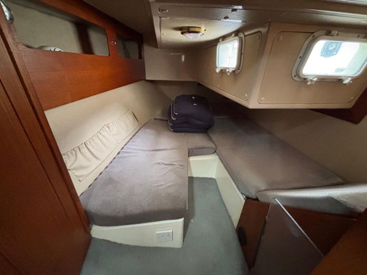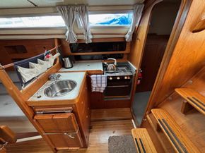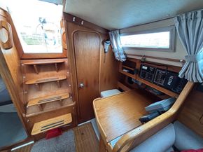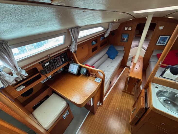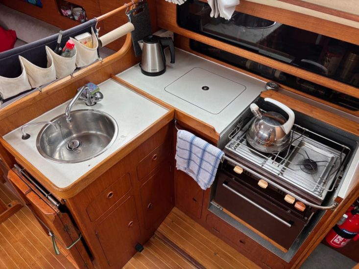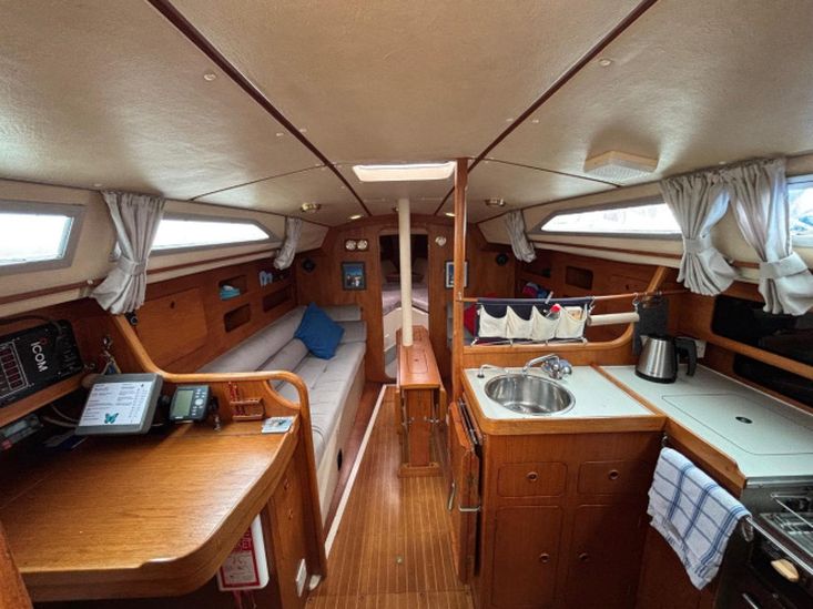 Eberspacher warm air diesel heating. Goodman sound system with speakers. Her galley has a Plastimo Atlantic gas cooker with 2 burners, grill and oven, refrigerated coolbox, pots, pans, cutlery and crockery, hot and cold water supply to sink, hot water is via a caloriier or 240v immersion heater. Approx 25g water tank. Jabsco marine toilet, wash basin and hot and cold water in separate heads compartment. Chart table. Saloon table, folding galley table. Saloon and forward opening deck hatches. Grey fabric upholstery, curtains, teak & holly cabin floors with carpet to forward and aft cabins.