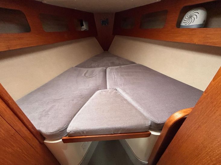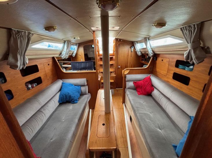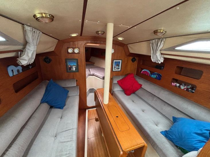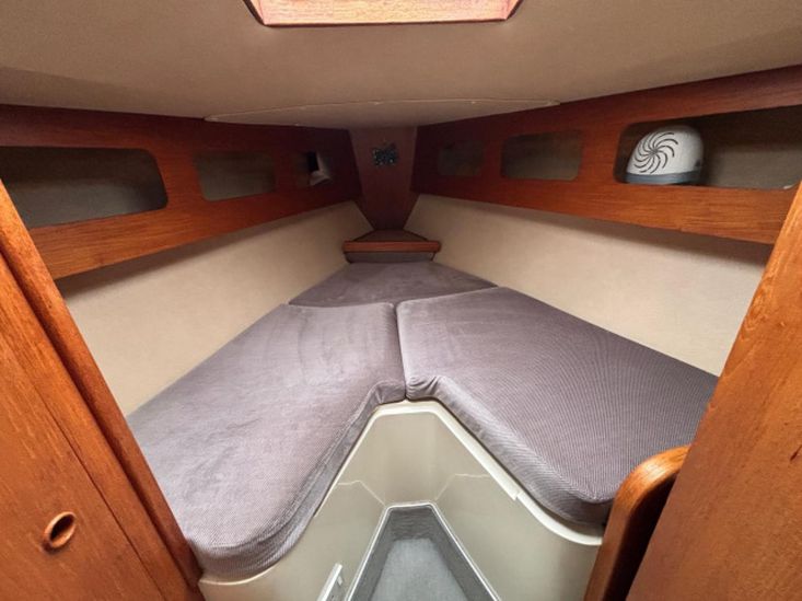 She has 6 berths including 2 āVā berths in the forward cabin, 2 single settee berths in the saloon and a double berth in her aft cabin.