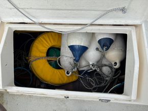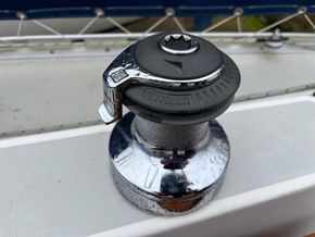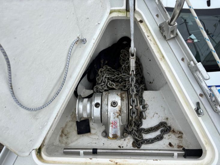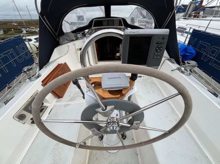 Stainless steel pushpit, pulpit and guardwires, blue sprayhood, wheel steering with wheel cover in blue, spray dodgers with name, cockpit cushions, cockpit table, boarding ladder, bathing platform, spinnaker pole, 2 x Lewmar self tailing sheet winches (2011), 2 x Lewmar halyard winches, outboard bracket on pushpit, Suzuki 2.5 outboard, plough anchor with 40m of 8mm chain (2025), Lewmar manual anchor windlass (2011), cockpit shower, mooring warps and fenders.