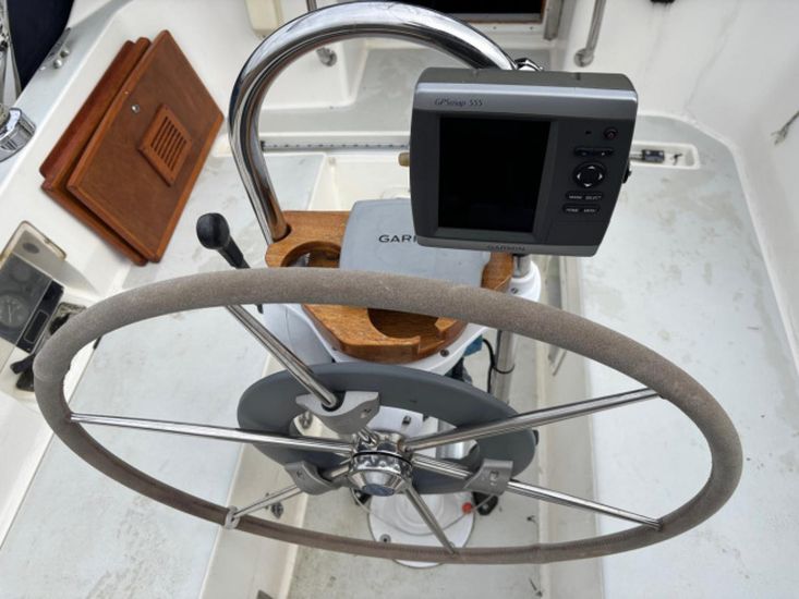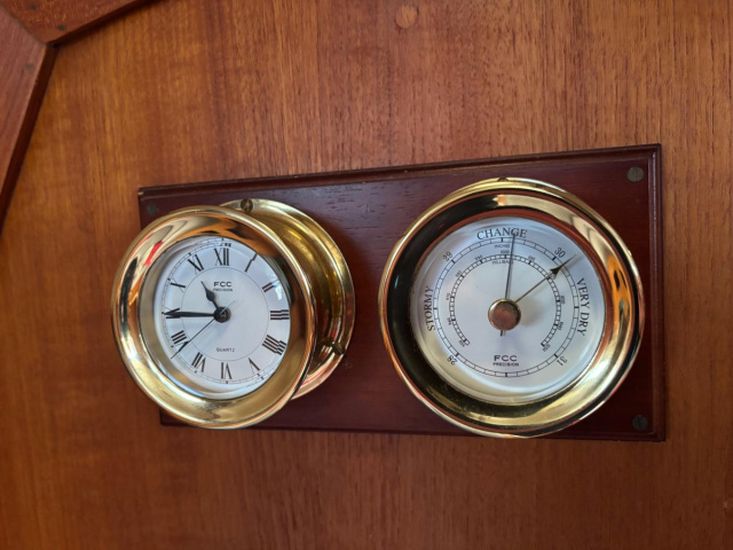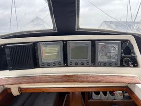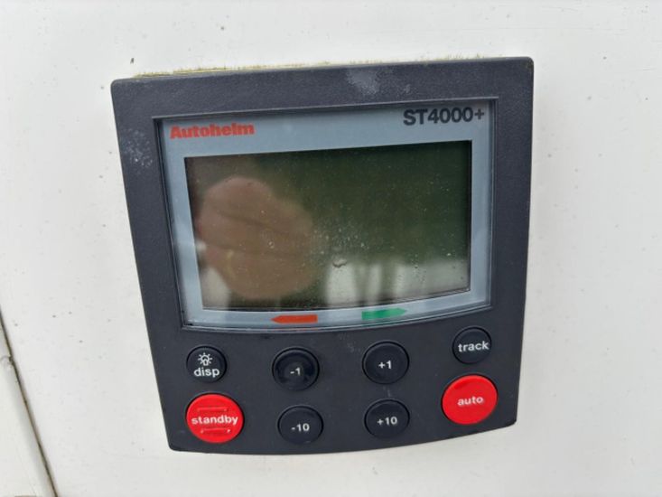 Plastimo compass, hand bearing compass, Raytheon ST60 depth and log, Raytheon ST60 wind, Nasa SX 35 DSC VHF radio, Autohelm ST4000 wheel pilot, Garmin GPSMap 555 chart plotter, Raytheon Pathfinder radar, Garmin 128 GPS, clock and barometer, navigation lights.