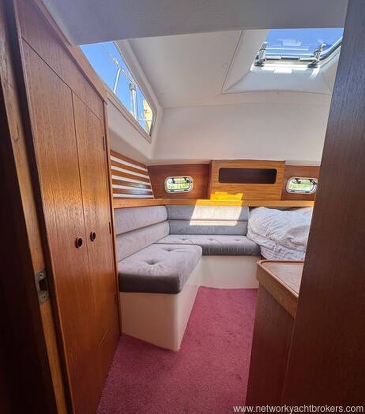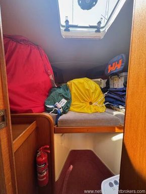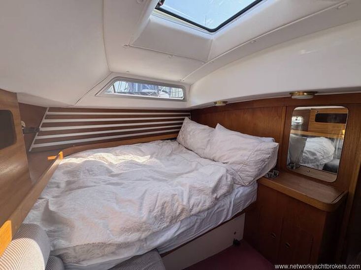 Forecabin: with V berth and infill, hanging locker, cupboard and shelves; hatch to foredeck