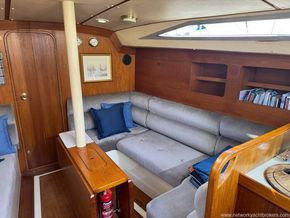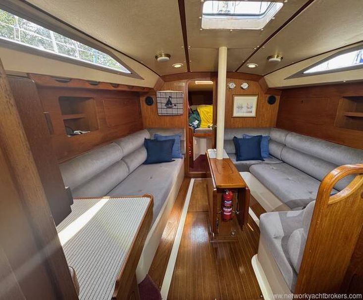 Saloon: a U shaped settee to starboard with a single settee berth opposite. The centrally mounted table folds out to the complete width of the saloon
