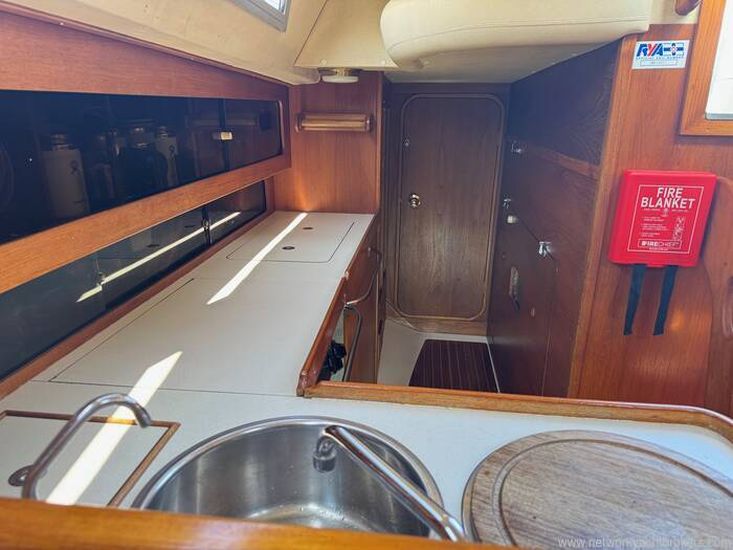 Galley: large and immediately opposite the toilet compartment, L-shaped; hot and cold pressurised water system, twin stainless steel sinks, cooker, top opening icebox