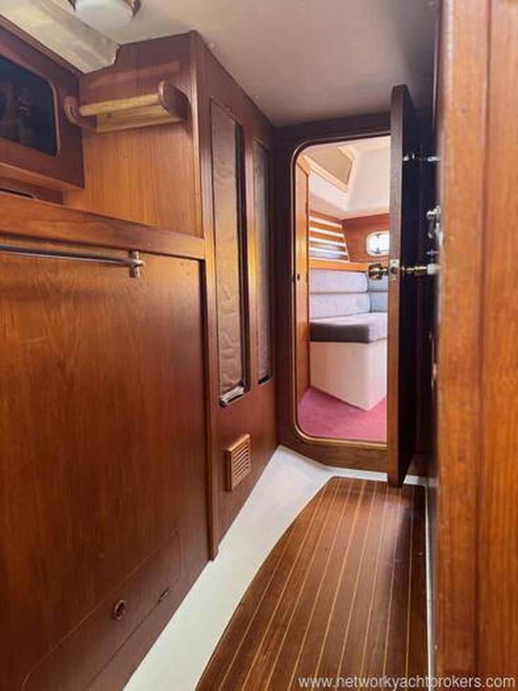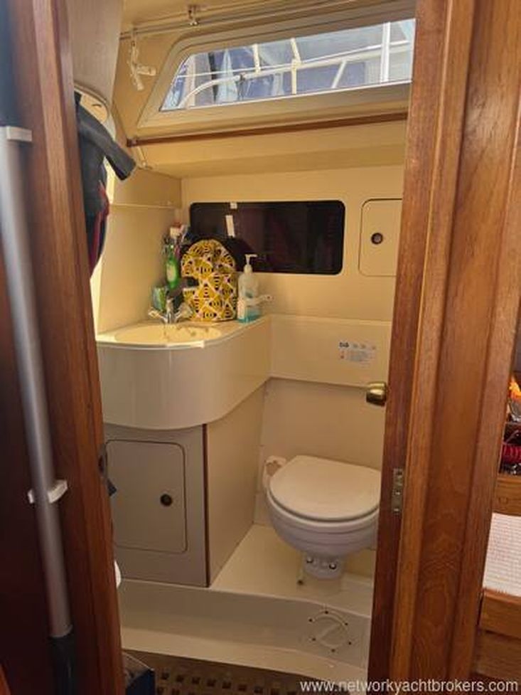 Heads: port side, aft of the navigation area convieniently adjacent to the companionway steps; manual marine toilet, shower and hand basin, storage lockers