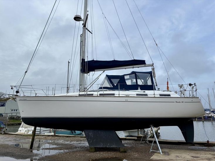 Freshly antifouled and prepared for 2026, she is ashore at Birdham Pool Marina and ready for inspection — a rare opportunity to secure a cruising-ready Moody 36CC.