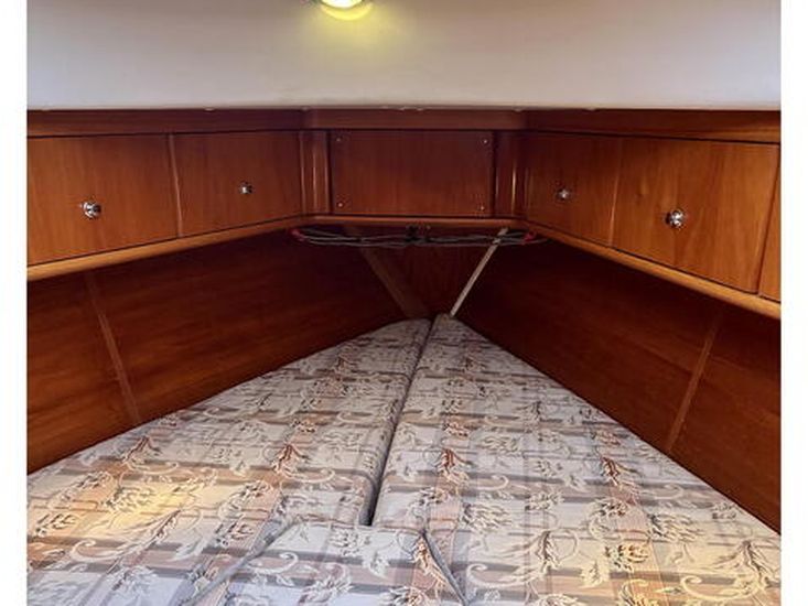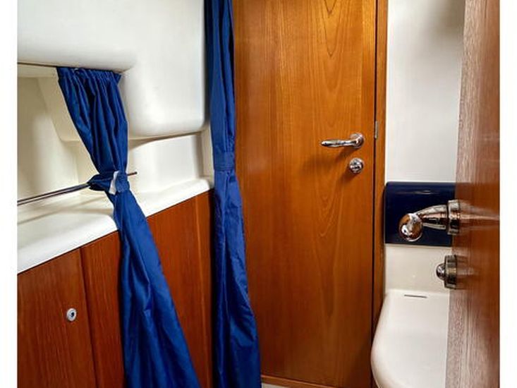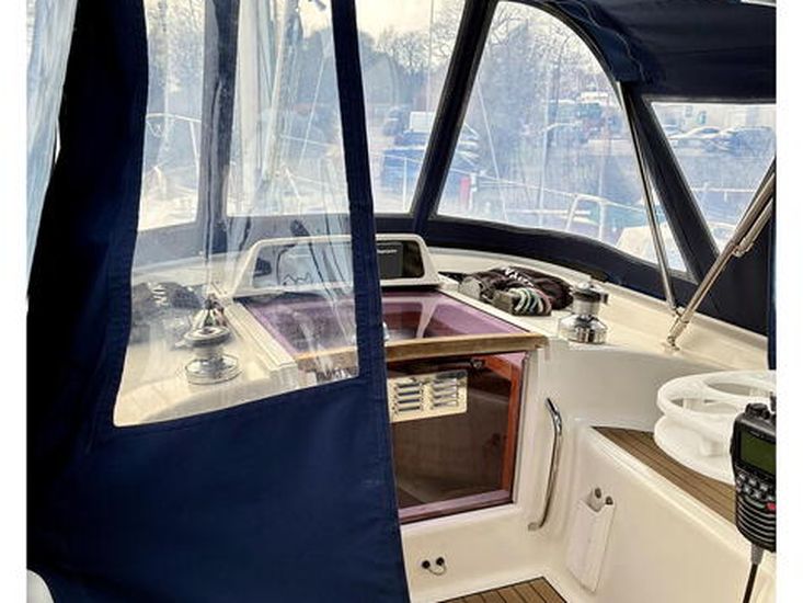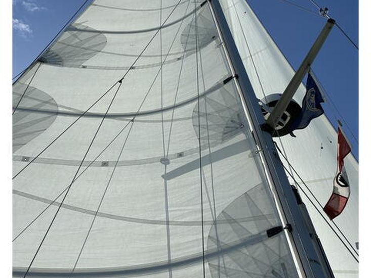 A 2023 refit added new sprayhood, cockpit enclosure, bimini, stackpack, 110W Marlec solar panel and upgraded batteries, enhancing genuine off-grid cruising. Below decks, seven berths across two cabins include a spacious aft owner’s suite, with Eberspacher heating, full galley and comprehensive Raymarine navigation suite.