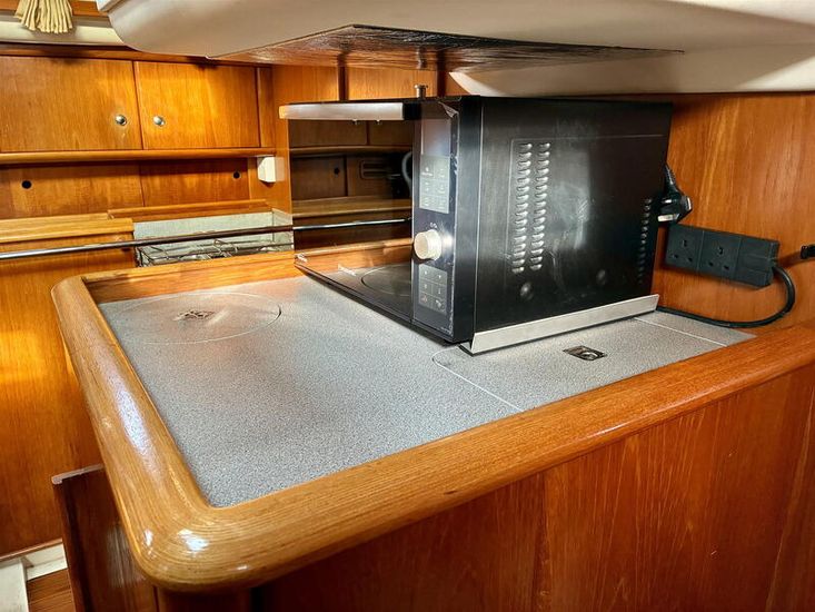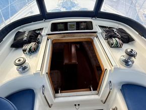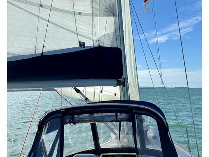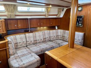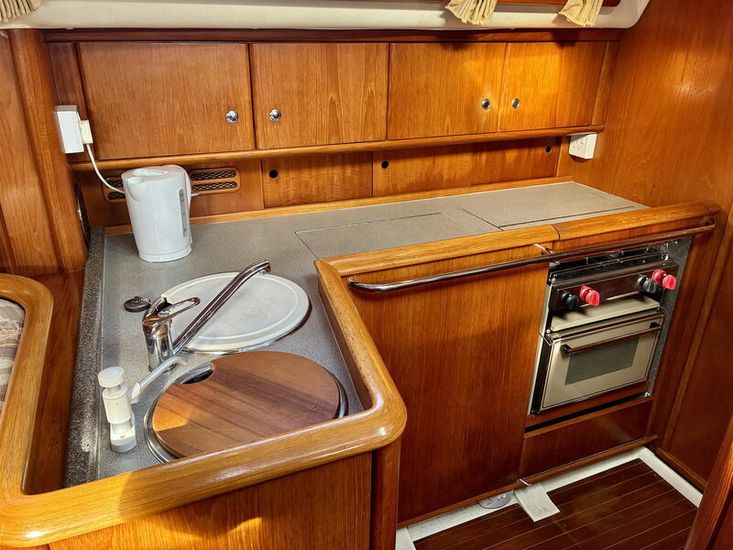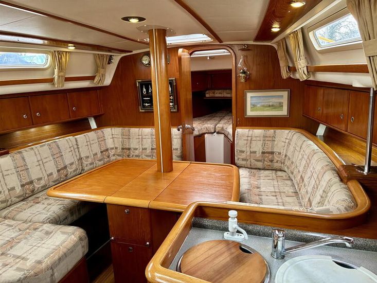 Powered by a Volvo MD2040 40hp engine (1,561 hours, Feb 2026) with saildrive and folding prop, plus a Vetus 55kgf bow thruster (new 6-bladed prop 2023), manoeuvring is effortless. Tankage includes 218L fuel, 327L water and 30L holding tank. The Selden sloop rig (standing rigging 2016) carries Hyde fully battened mainsail, furling genoa and Crusader cruising chute, with Lewmar self-tailing winches for easy handling.