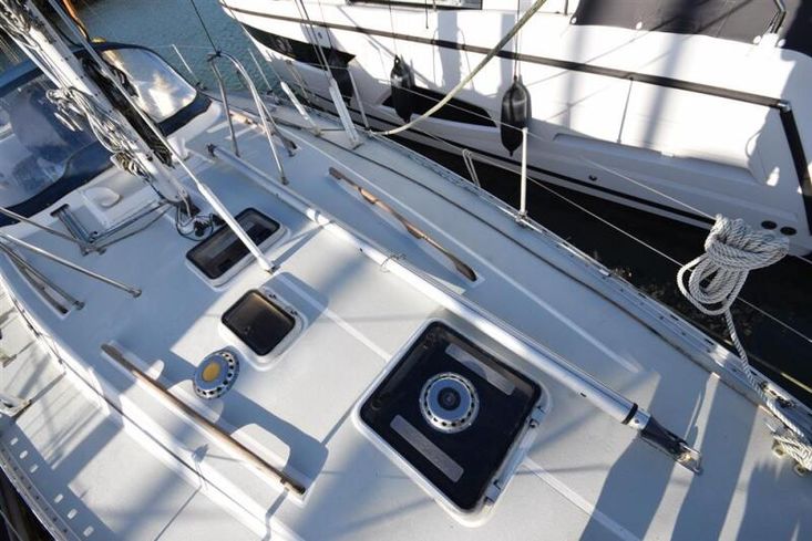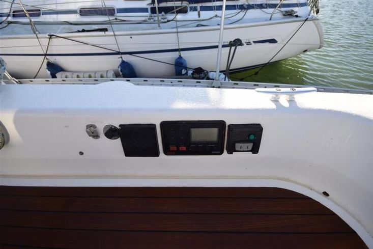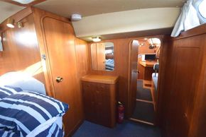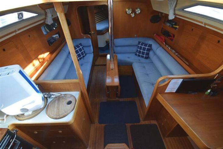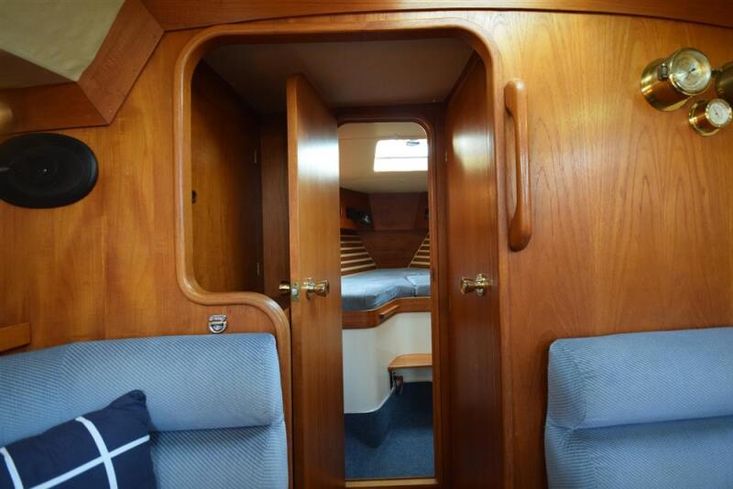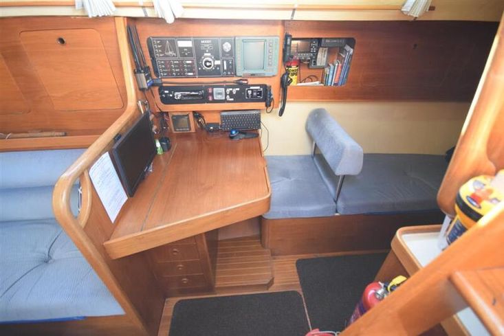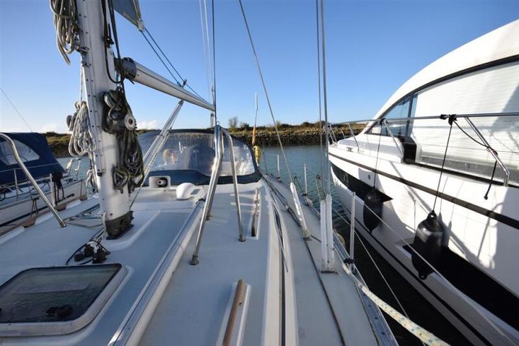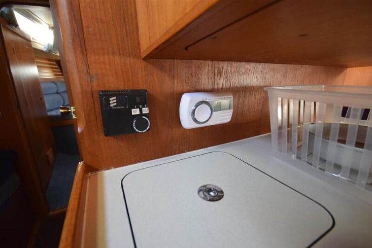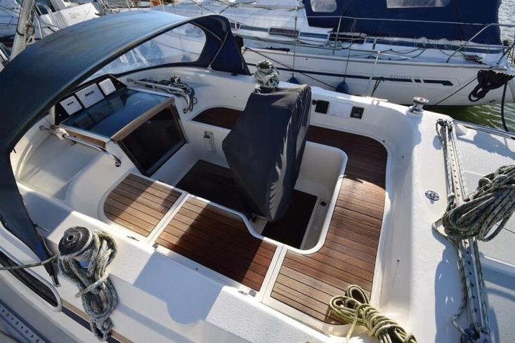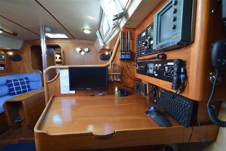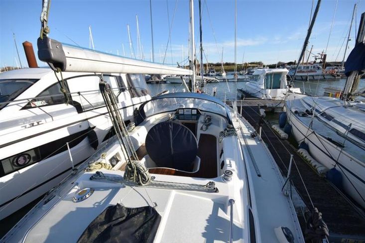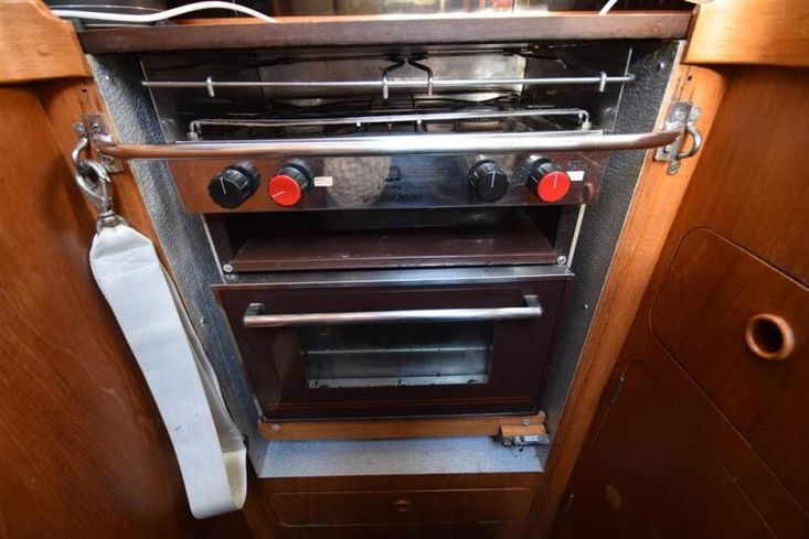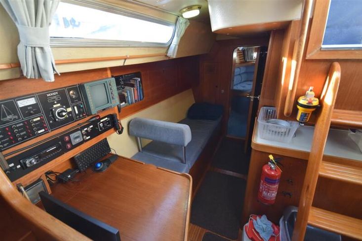 The layout offers up to seven berths with two double sleeping cabins separate from the main accommodation. In the forecabin, V berth with infill and stowage under. Opening hatch to deck. Hanging locker. En-suite heads compartment with Lavac electric marine toilet, shower and washbasin. The heads can also be accessed from the saloon. In the saloon, dinette to port with single settee berth opposite. Fixed table with drop leaves. Opening hatch to deck. Chart table to starboard with galley opposite. Plastimo Neptune 2000 two-burner gimballed gas cooker with grill and oven. Cooker removed and professionally refurbished 2020. Gas safety certificate January 2020. Twin stainless steel sinks with hot and cold pressurised water supply. Hot water heated by engine or immersion heater. 250 litre freshwater capacity. Refrigerator. Walk through to aft cabin with single berth to starboard. In aft cabin, double berth to port with settee opposite. Hanging locker and good general stowage. En-suite heads compartment with marine toilet and wash basin. Eberspacher diesel fired hot air central heating. 240 volt shore power system with three sockets. A deep centre cockpit allows further entertaining space, with a folding teak cockpit table.
