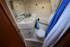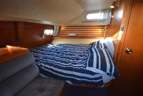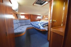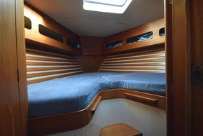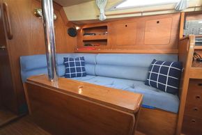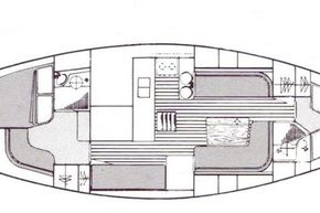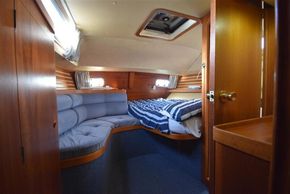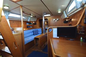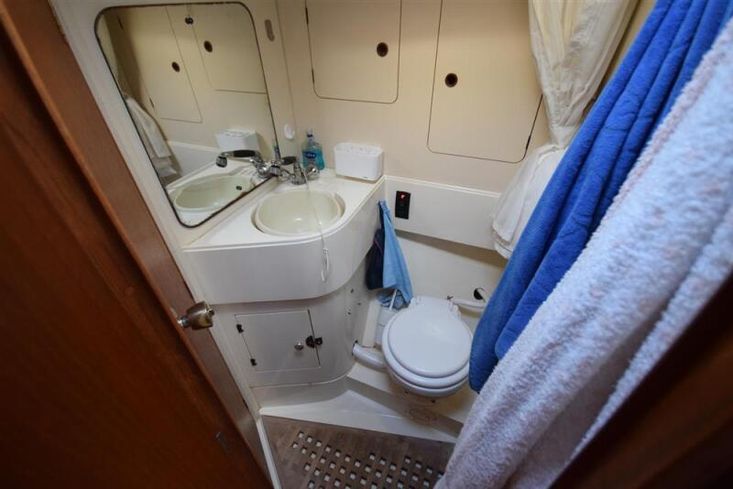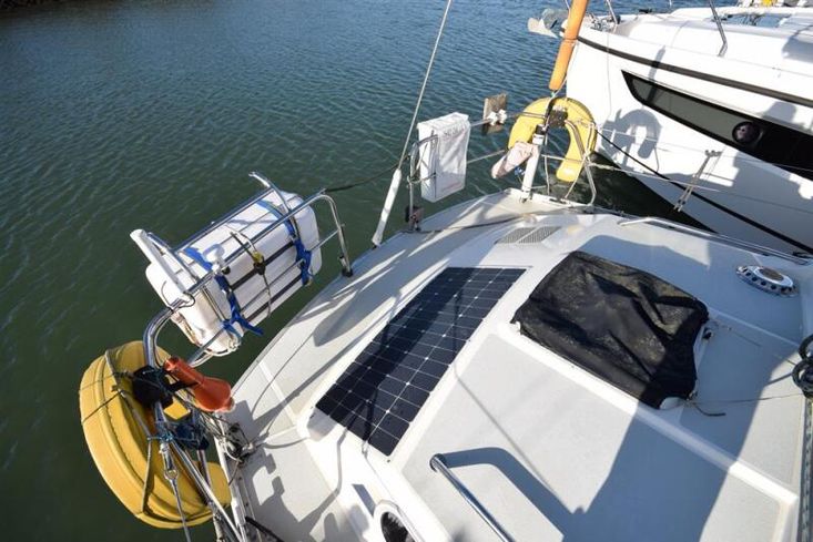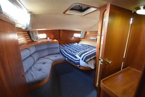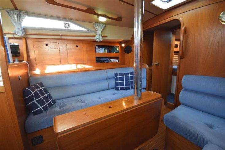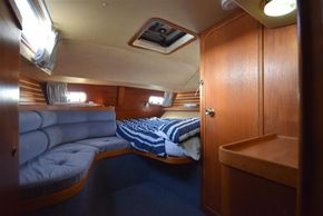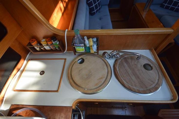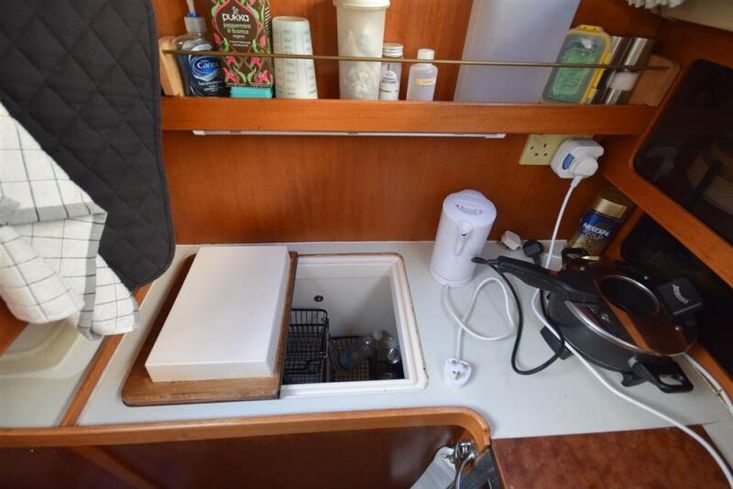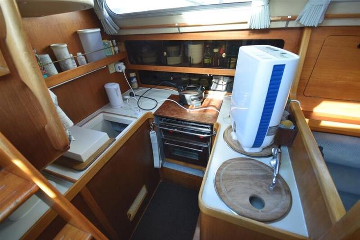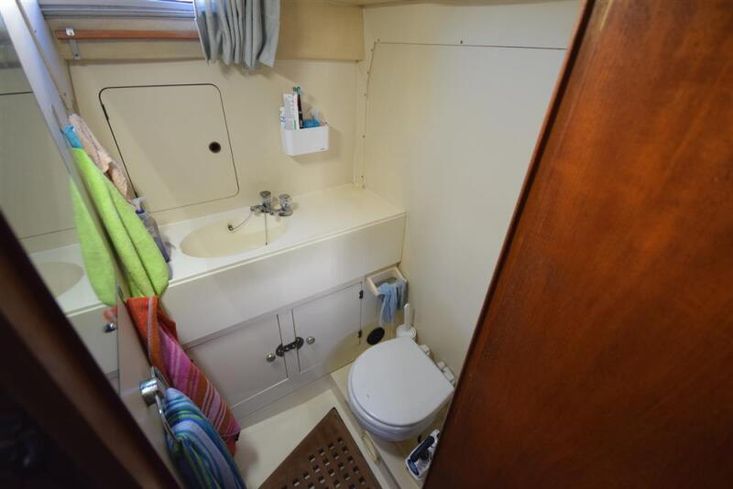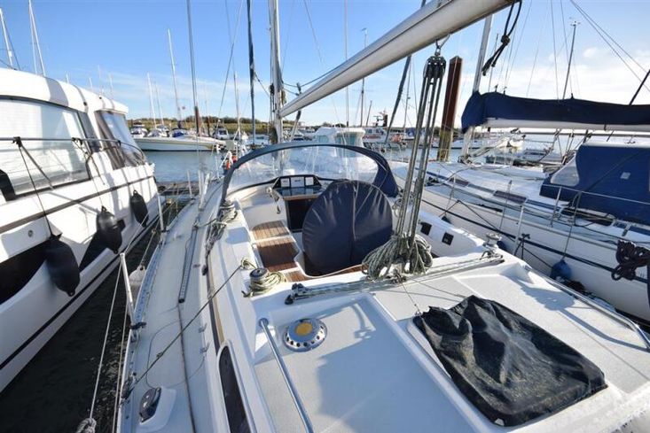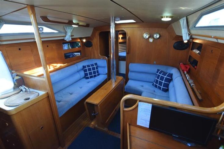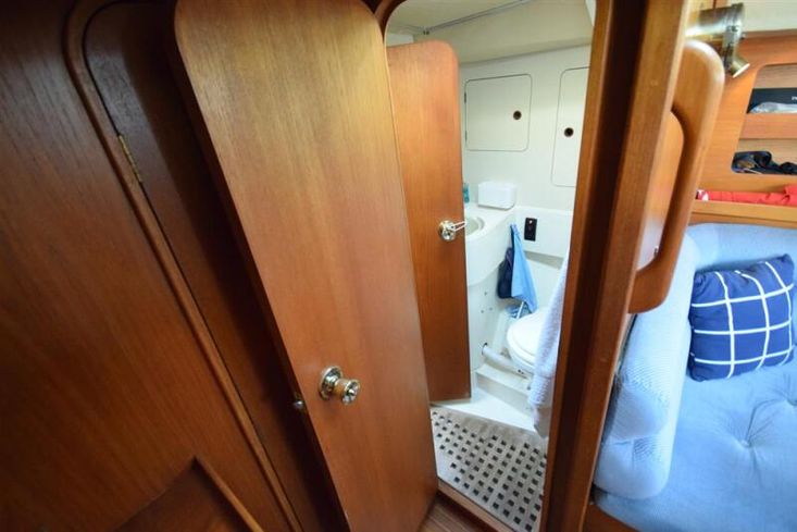 The layout offers up to seven berths with two double sleeping cabins separate from the main accommodation. In the forecabin, V berth with infill and stowage under. Opening hatch to deck. Hanging locker. En-suite heads compartment with Lavac electric marine toilet, shower and washbasin. The heads can also be accessed from the saloon. In the saloon, dinette to port with single settee berth opposite. Fixed table with drop leaves. Opening hatch to deck. Chart table to starboard with galley opposite. Plastimo Neptune 2000 two-burner gimballed gas cooker with grill and oven. Cooker removed and professionally refurbished 2020. Gas safety certificate January 2020. Twin stainless steel sinks with hot and cold pressurised water supply. Hot water heated by engine or immersion heater. 250 litre freshwater capacity. Refrigerator. Walk through to aft cabin with single berth to starboard. In aft cabin, double berth to port with settee opposite. Hanging locker and good general stowage. En-suite heads compartment with marine toilet and wash basin. Eberspacher diesel fired hot air central heating. 240 volt shore power system with three sockets. A deep centre cockpit allows further entertaining space, with a folding teak cockpit table.