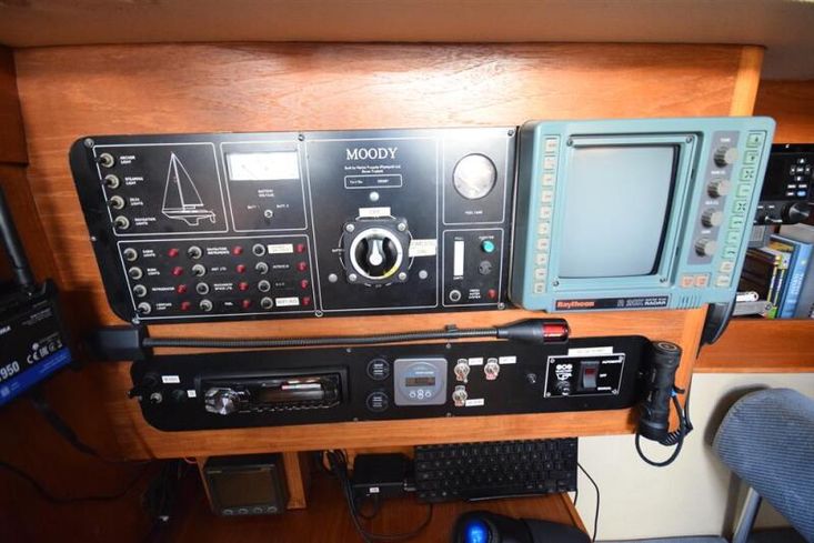 Built by Marine Projects in 1990 for Moody Marketing to a design by Bill Dixon. White GRP hull with style stripes. Alloy toe rail. White GRP superstructure with moulded non-slip to deck. Shallow draft cast iron Scheel keel. Skeg hung rudder. Wheel steering. Self-draining centre cockpit. Teak laid cockpit seating (new 2019). Sugar scoop transom with boarding ladder. Hull epoxied below waterline 2013. Saloon and aft cabin windows renewed 2019.