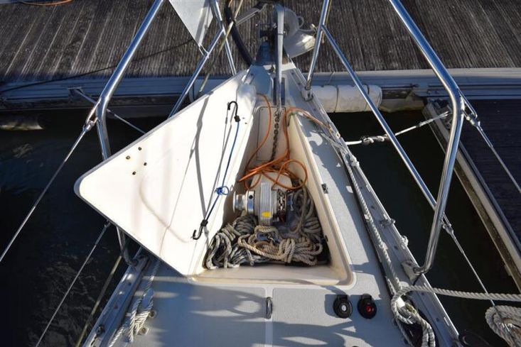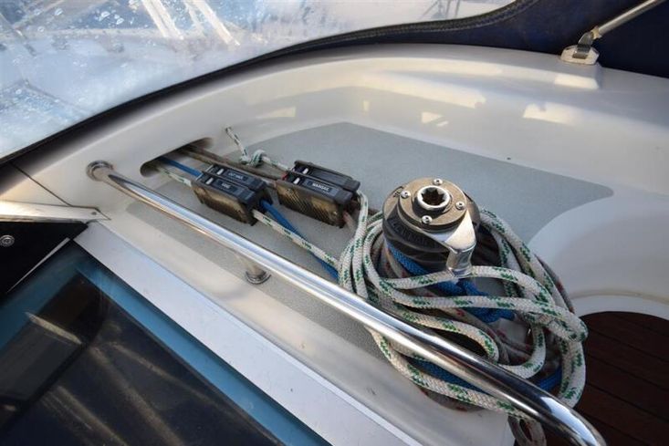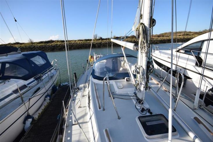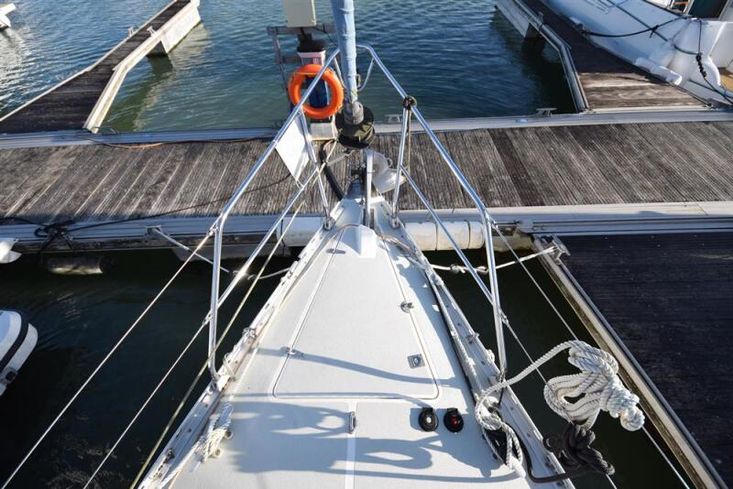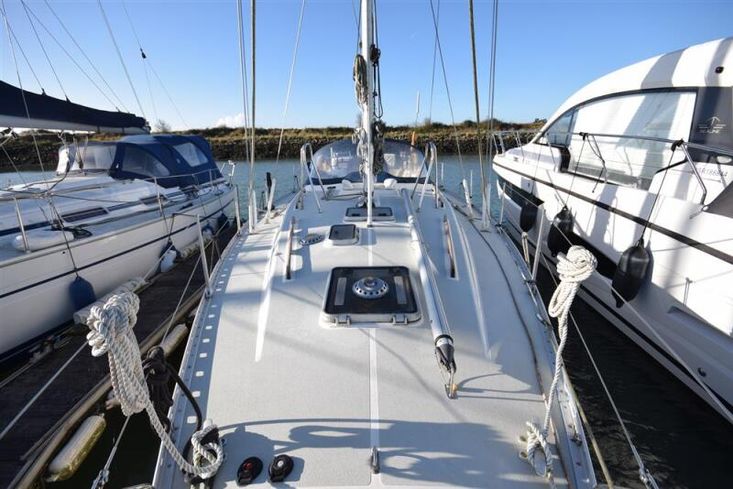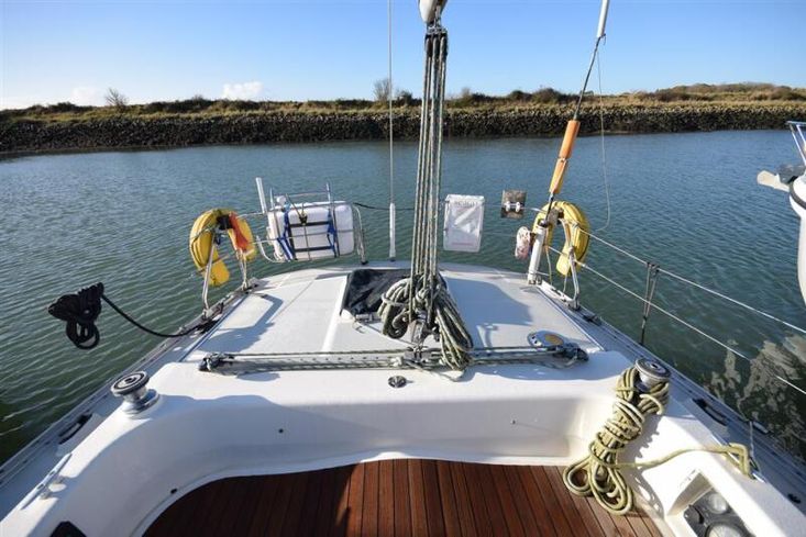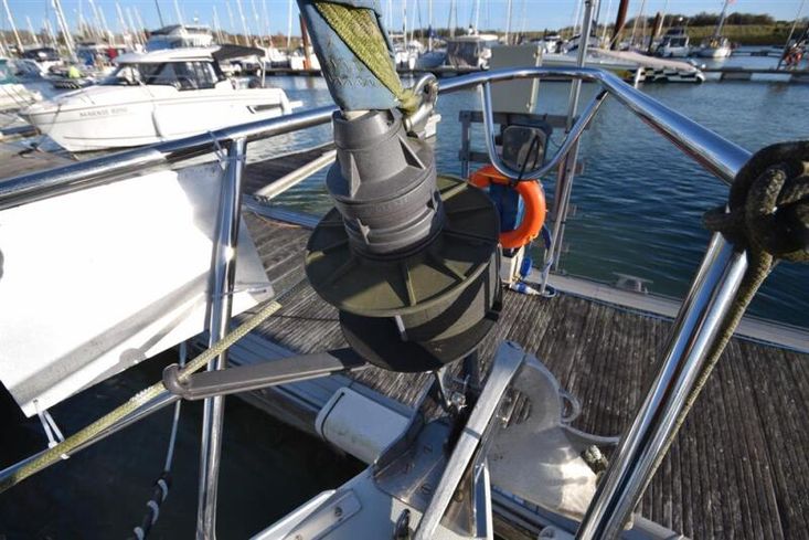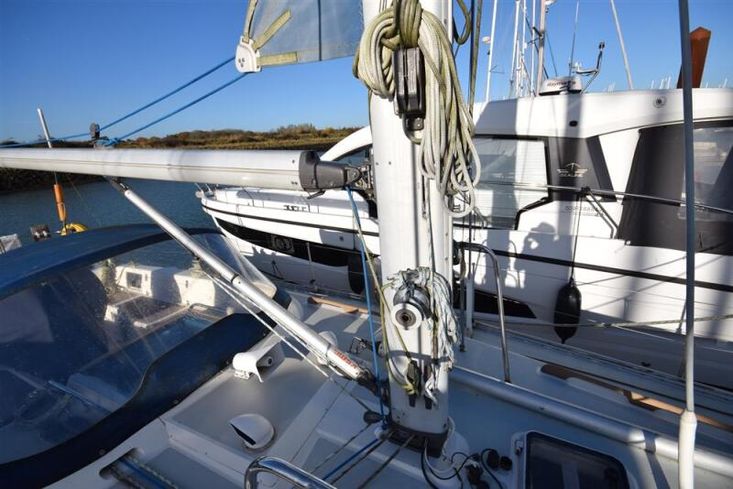 Masthead rigged sloop. Anodised aluminium, deck stepped, double spreader mast and boom by Kemp Spars. Stainless steel standing rigging ( new 2001, rig check 2015). Terylene running rigging. In-mast furling mainsail. Furlex headsail furling system. Some lines led back to cockpit. Two Lewmar 43 self-tailing sheet winches. Lewmar 16 self-tailing control line winch on coachroof. Lewmar mainsheet winch. Two Lewmar 16 self-tailing halyard winches on mast. Spinnaker pole. Rod kicker.
